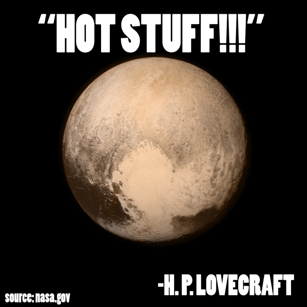 That is why, had I a time machine, I would bring Lovecraft to modernity and sit him in front of a computer and let him watch Pluto come into focus, as it has for all of us, an image at a time (which I think would be all he could handle). I want him to lean into the screen and search every pixel and take notes and explain things and clap in solidarity with the brilliant NASA scientists who helm this mission. Later, I would like to sit outside in the warm evenings we currently have in Sacramento, and let him create into the air, bringing his fiction into as much focus until he quiets and retreats into thought, processing the revelation as his mature mind takes over from the youthful mania.