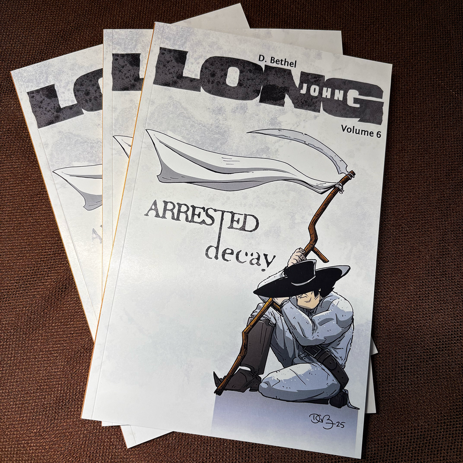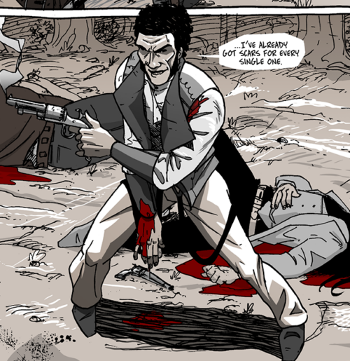 So, I struggled for a moment over whether to include editorial captions like you see in mainstream comic books, where continuity stretches over sixty years in some cases. When they call back to a previous moment, usually a small caption appears in that panel that states “as occurred in issue #274” or whatever. I wondered if people would remember that Bishop was shot through the right forearm in chapter 3 or that Rich Jack said he couldn’t swim at the beginning of this very chapter. I knew I wouldn’t put them in the book, but I wondered if I should do it for the page posted on the website.