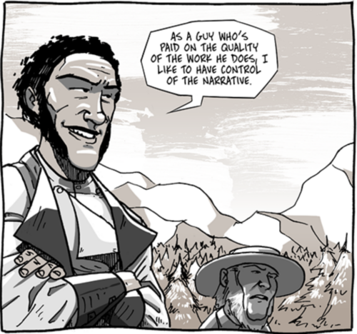 There is an argument to make that Long John is about telling stories. From the stories you tell about yourself or are told about you, to how a story is told (and who is telling it), it’s an idea that’s woven throughout the series. This page, however, is explicitly a callback to Chapter 3 as Bishop was trying to get Juan John to come out from the cabin of his own volition. Similar to then, he’s playing with his prey a bit, using the power of language to create the power dynamic between them.