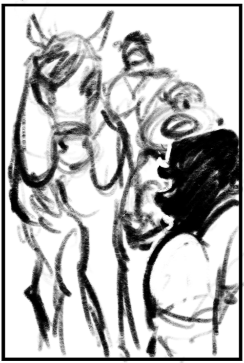 So, during an in-class writing activity my students were doing for a large portion of the class on Monday, I had my sketchbook and just drew shapes, quickly landing the image of the scythe with the banner tied to it and, after a few different ideas, Long John posed in the manner he is in the final image.
