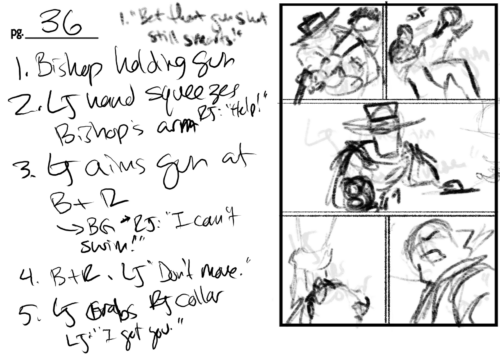 So, I struggled for a moment over whether to include editorial captions like you see in mainstream comic books, where continuity stretches over sixty years in some cases. When they call back to a previous moment, usually a small caption appears in that panel that states “as occurred in issue #274” or whatever. I wondered if people would remember that Bishop was shot through the right forearm in chapter 3 or that Rich Jack said he couldn’t swim at the beginning of this very chapter. I knew I wouldn’t put them in the book, but I wondered if I should do it for the page posted on the website.