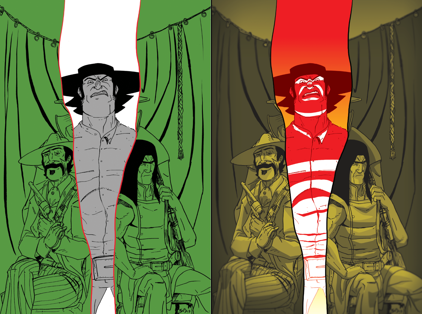 But this idea came out of nowhere one day (I think while I was watching my students do peer workshops, actually), and I quickly doodled down the idea of a daguerreotype (more specifically, a carte de visite, a popular early paper photograph) of The John posse but with the middle torn out so the “before” Long John remains unseen and, in his place, is the current Long John of the comic. It works thematically for the chapter and provided an interesting visual element. The daguerreotype portion was inspired by images that popped up during my research of the period, where a surprising number of outlaws––as a means to thumb their noses at the law and “civilized” society––would openly flaunt their status and go get professional portraits taken. The most famous of these is the portrait of Butch Cassidy with his Wild Bunch, which he would (and this may be apocryphal) send to law enforcement once he escaped their chase.