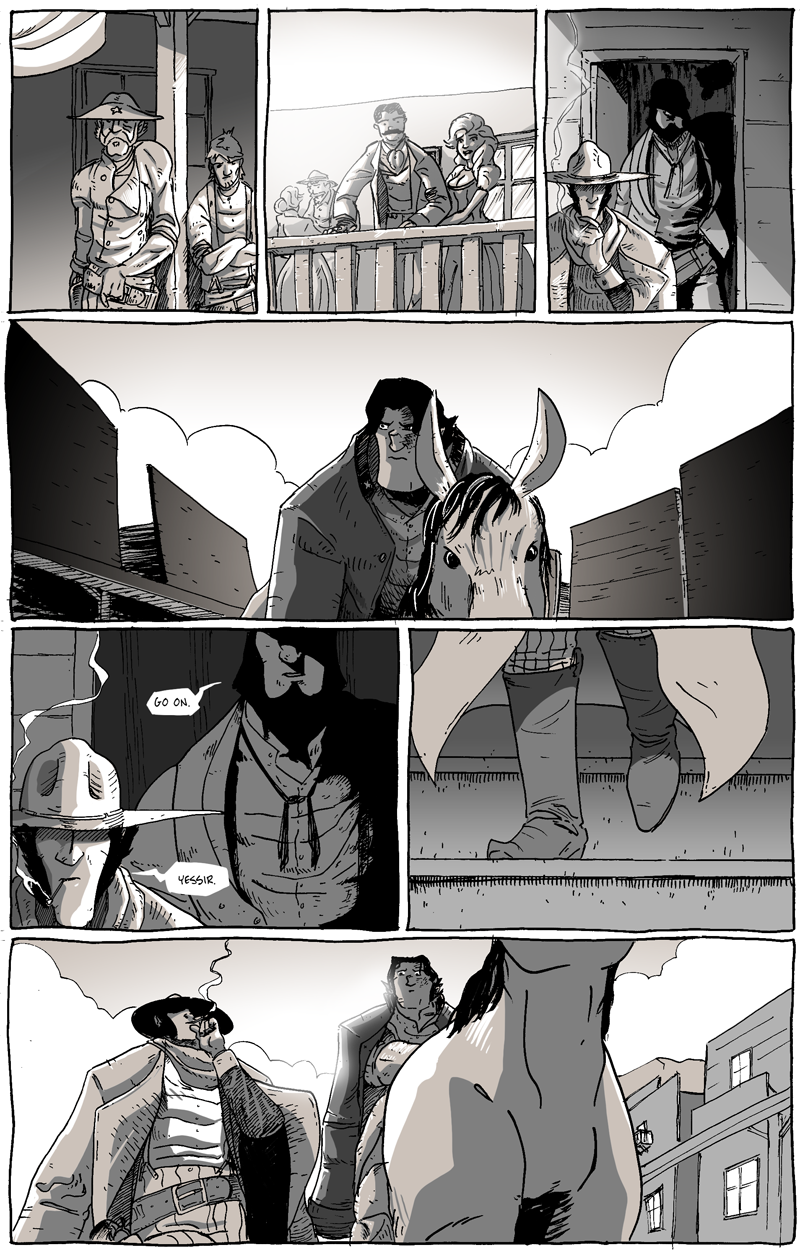 Am I a Symbolist? No, not really. However, there are values and goals within that movement that I have tried to apply to Long John. Without giving anything away, or trying to tell you what Long John is “about”, one element being reinforced throughout the early chapters of the comic is to always place Long John in the middle of strong parallel lines, evocative of a variety of possible themes––and they all may be valid. This page shows that element quite clearly in panel 4 (the second row); the idea of having “widescreen” panels in which Long John was “trapped” and confined greatly appealed to me and helped open up my understanding of the character quite a bit.