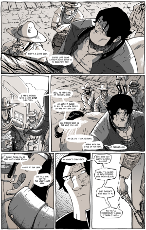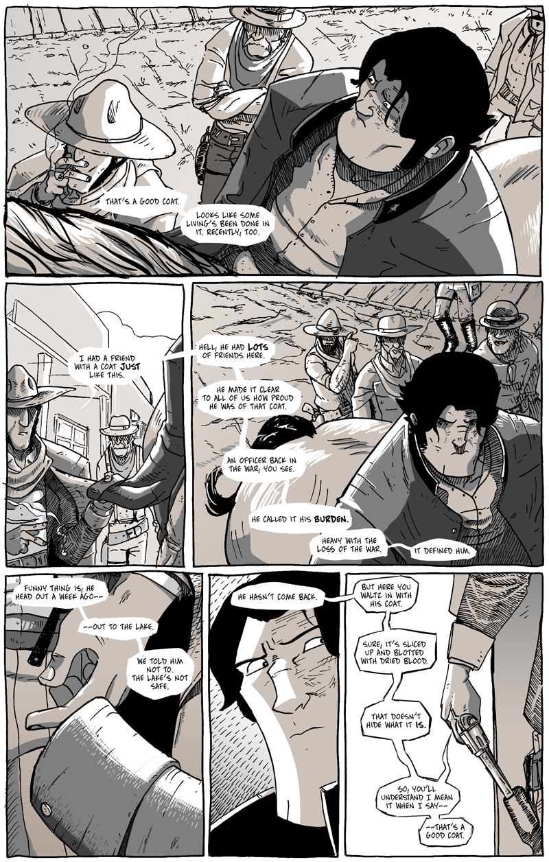 With this page, the print version will have the last bit of dialogue––”–that’s a good coat.”––will be moved to the top of the following page, if only because I feel that the enticement of “What’s he gonna say?!” can work as a page-turn mechanic for print much more than the web, because no one will be willing to care about how that sentence is going to end two days (or, in this page’s case, five days) from now. The actual enticement for both cases is, “Oh crap, he’s drawing his gun! What’s he going to do?!” but, with the displaced dialogue, it’ll help to get that reader to turn the page even faster.