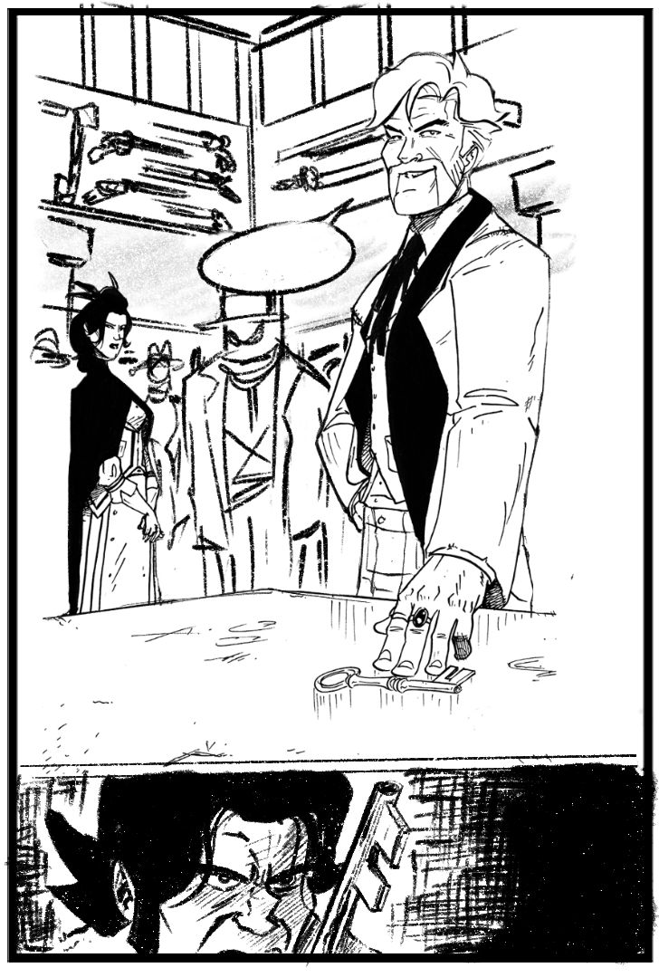 The thumbnail drawing for Chapter 5, page 17. Rich Jack and The Rook are repurposed from a drawing from 2018 with a new background drawn in. Click for larger version.