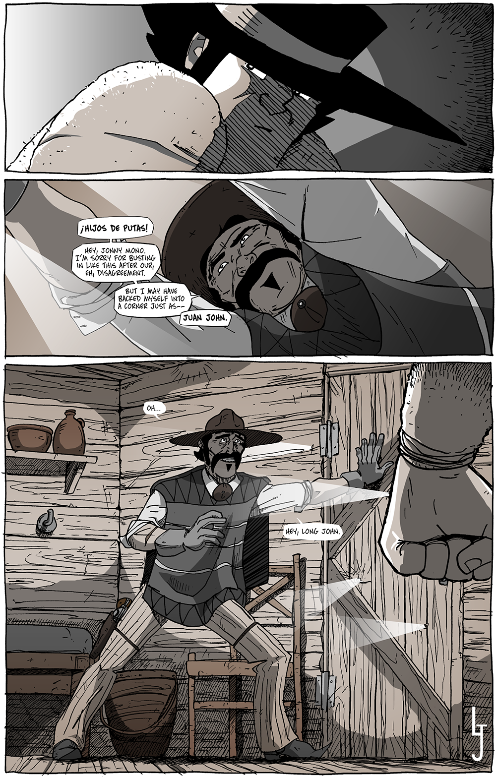I’m not sure if this counts as ending on a cliffhanger, but if someone described this page as doing so, I wouldn’t disagree. We end on a meeting: welcome Juan John Velazquez, the third and final member of the Johns to appear in the comic. Looking back, I’m not sure how happy I am with the design of both Juan John and Jonny Mono. If anything, a bit of my implicit bias came through and landed them in pretty stereotypical clothing, which I’m not happy about. This is not an excuse, but when designing characters, I’m going for silhouette––I want them to look distinct and separate from each other so that they can be as easy to read as possible. Juan John is tall and sleek––like parallel lines. Juan John is a square, framed by his poncho. Long John is top-heavy and wide, almost like a blending of the other two Johns. Also, this is not an excuse, but the outfits are considered and deliberate––they’re practical. I really break down who these characters are and what they would have on them; in a sense, they play on the stereotypes (Long John, too, as the Eastwoodian, laconic tough guy; his design is as full of tropes as the other Johns) to do their work, but––as we’ll see in the next chapter––they are truly a team. How well that team holds together after two of them bushwhack the third, we’ll see that in Chapter 3.