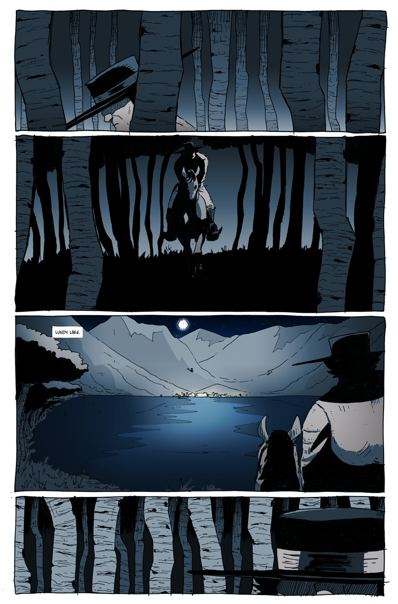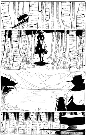 I was particularly proud of the line art for this page (rendering the aspens was fun in a zen kind of way), and is an interesting piece to show how tones and needs can change during the coloring stage. The hardest hit by this page was panel 2, but it was done in the service of drama and I’m quite happy with the final result.
