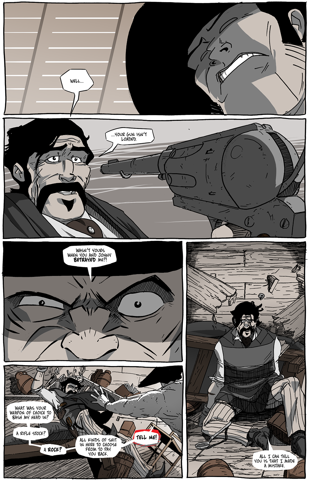 Chapter 3 is where I finally gained a confidence of hand when using these new tools and techniques. I’m definitely still learning and have a long road to walk down, but I have gained a vocabulary for these tools with which I am becoming conversant. The third panel of this page, for example, was inked entirely with a brush, and not for an experiment nor from some misguided, half-understood knowledge from the masters. Instead, I needed that panel to be energetic and vibrant, almost comical. The Microns’ tiny little lines wouldn’t effectively give me the look I was going for, but the flick of a brush tip could.