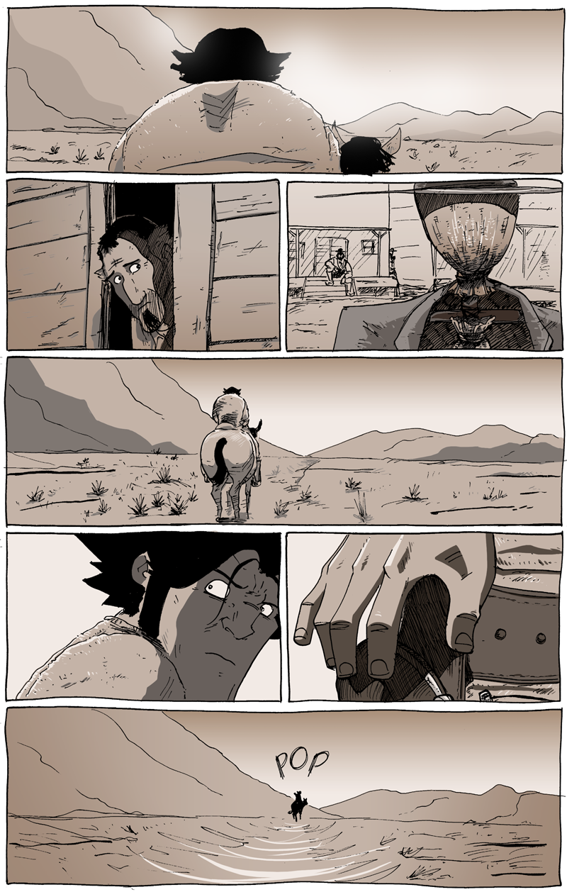Like the introduction of Long John, this was a page I’ve had in my mind––mostly––for a long time, now. Specifically, I had the three wide panels in mind and knew that the small panels would be a montage of the town. With that in mind, it was a rather easy page to draw (I definitely don’t get to say that too often).