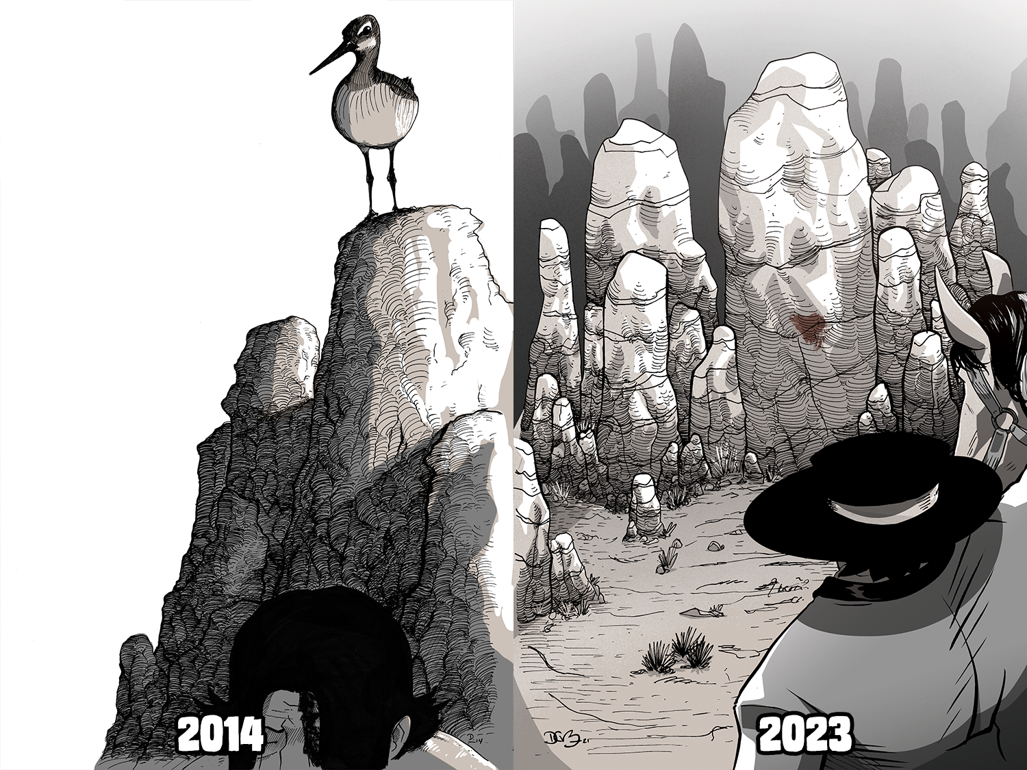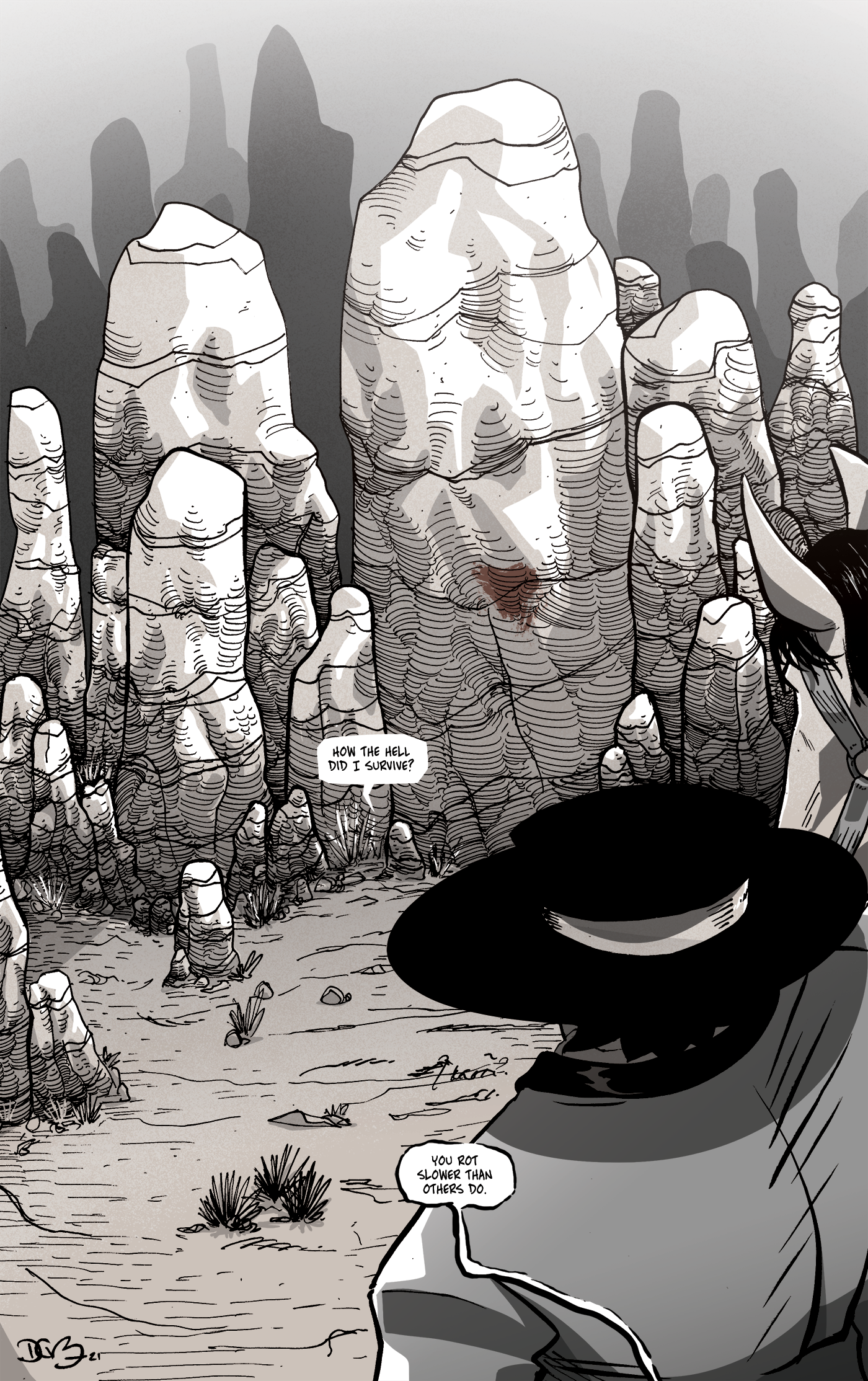 I found I had to refer back to early pages of the comic for reference more than ever before because of all the different threads that came together during this chapter. Though tufa have shown up since the beginning of chapter 1 (seen in the Hellrider stories, “Save the Bones” and “The Patient Feast”––with the latter exclusively available in the Volume 4 book and ebook), I haven’t really had to draw and color one since 2014. Coming back to where we first found Long John in chapter one was a scene I looked forward to.