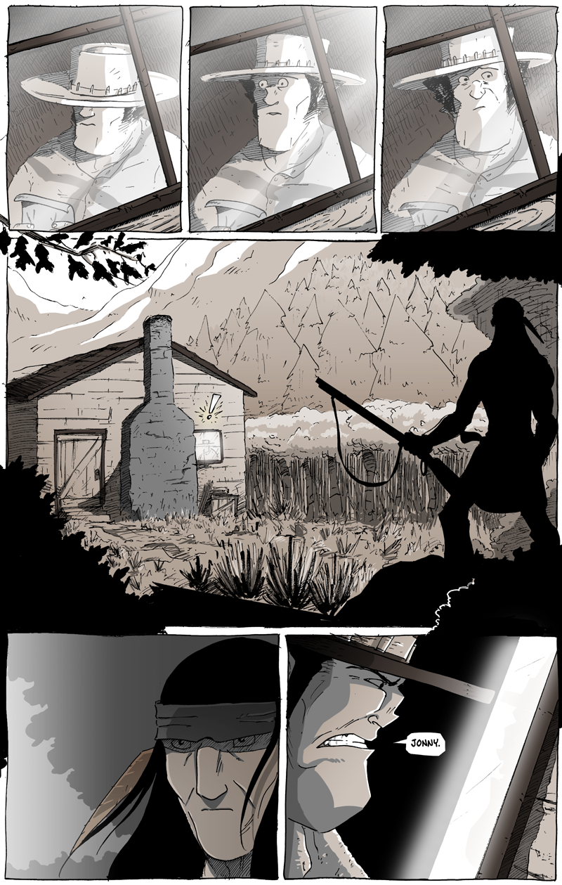 The technique is an idea similar to those “search for the differences” game where a reader is presented two pictures with slight differences between them and asked to spot where the similarities diverge. The reader has to focus on the art, looking from corner to corner and take it all in. When presented with multiple panels that basically look the same, the reader naturally tries harder, bringing in the focus, wanting to find the differences and, in the case of a comic, pieces together the subtlety. In a sense, it’s a chance to show off the “acting”; my goal is to actually have the readers “see” Long John turn to look at the window in their minds rather than just show him looking up in one panel and then an outside shot in the next. He’s moving from one important moment (the advertisement) to another (seeing Jonny Mono outside), and I really wanted that small linking movement to stand out.