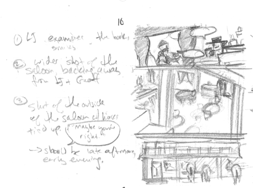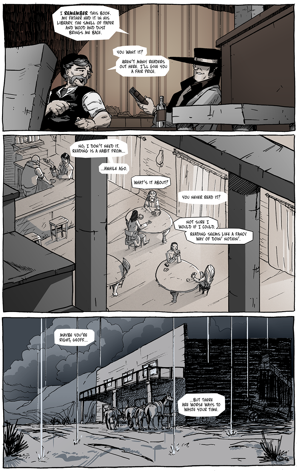 I pushed my art a lot with this chapter, and this page was a battleground as I fought with the composition as it related to not only the primary image in the panel but with the items in the extreme foreground, but also with the last panel, something I drew and the completely redrew (not an uncommon occurrence in this comic) and pasted over the original drawing.