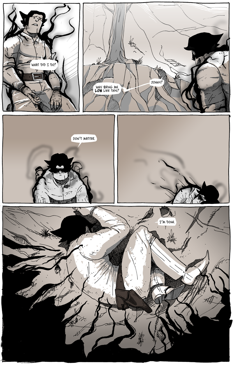 Long John lives in that muddy pool of choice; in fact, the story started at the culmination of him making a series of choices that––in conference with the own personal choices and needs of Juan John and Jonny Mono––caused him to be bushwhacked and abandoned in the middle of nowhere. So, the story is about him figuring out how to best recover from that situation and to deal with the choices that got him there.