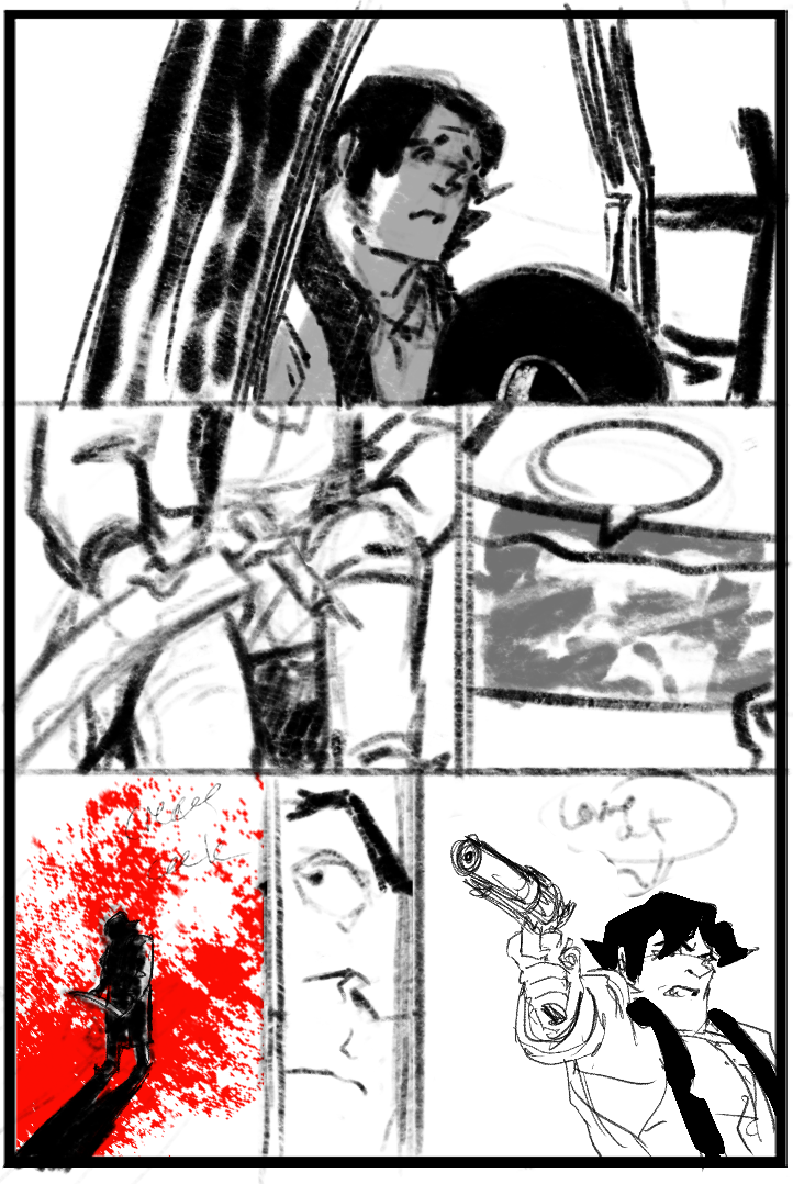 This page was another milestone in that the panel where we see Long John’s reflection in Hellrider Jackie’s blade has been an image I’ve had in mind for a very long time. At times subtle, at other times heavy-handed, the Long John/Hellrider juxtaposition is a central idea throughout the book (among others; I really don’t want to tell people what the comic “means”), and this moment was something I really wanted to build to. Coincidentally, panel 4 is strikingly similar to a Sketch Friday I did years ago honoring the memory of the recently deceased Stan Lee. That wasn’t intentional, though it stood out after I removed the gregarious blood effects I had planned to put in that panel (as evidenced by the thumbnail below). It kind of felt right, and I was all right with that.