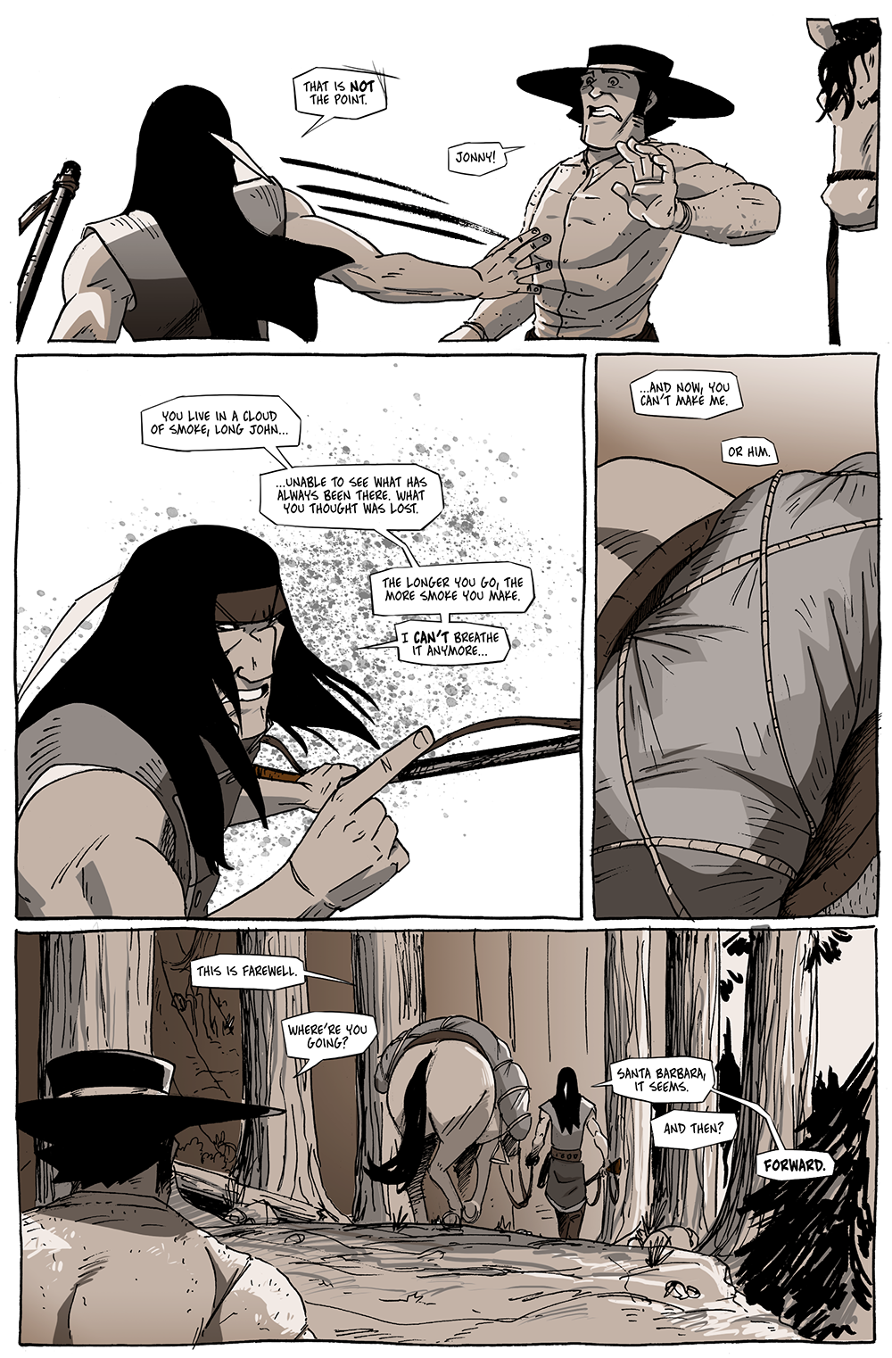 Much like the post-fight John talk before, and the Long John-Juan John talk before that, this showdown was a keyframe (to steal a term from animation) of the chapter, a major moment I knew I had to hit. Like those other two moments, the initial conception of this scene was rather long, where Jonny could finally lay out all of his griefs and we, as readers, would think, “Oh damn, he’s been holding back a lot for a long time.”