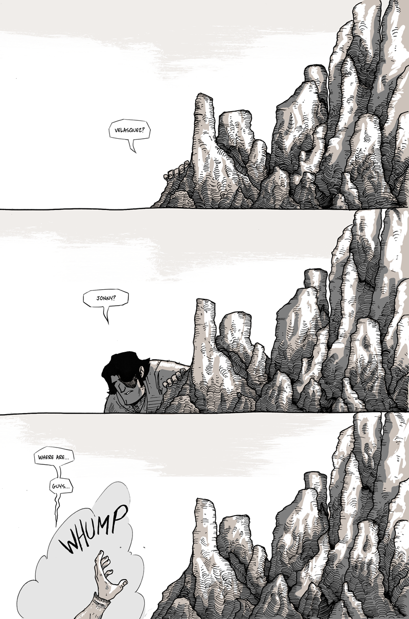 This is the first appearance of many hand-lettered sound effects that will appear in Long John. This isn’t the first time I’ve experimented with them. I was directly inspired by the works of Simon Roy whom I first found years ago when the internet was discussing his short, Jan’s Atomic Heart. I was intrigued by the book and was surprised when my local comic book store had a copy the week it came out (it wasn’t released through a major publisher). I devoured it and was impressed and puzzled by how Roy’s wavy, imprecise linework seemed so confident and consistent, carrying over into the sound effects and the lettering. Because of this consistency, it was one of the first times a comic really felt whole––it was in its entirety a complete piece created by a single artist––at this point, Roy was a young twenty-something in art school and I was…not. It was a very inspiring book in many ways, not the least of which was approaching sound effects in a more organic and artistic manner. Jan’s Atomic Heart was recently re-released as a collection of a bunch of Roy’s work by Image comics. Roy has gained more recent acclaim as part of the initial writing team and illustrating the reboot of Prophet for Image comics along with co-writer Brandon Graham. Though still working on Prophet as it draws to a close with issue #45, Roy is also co-creating a new––and very strange––mini-series at Image called The Field.