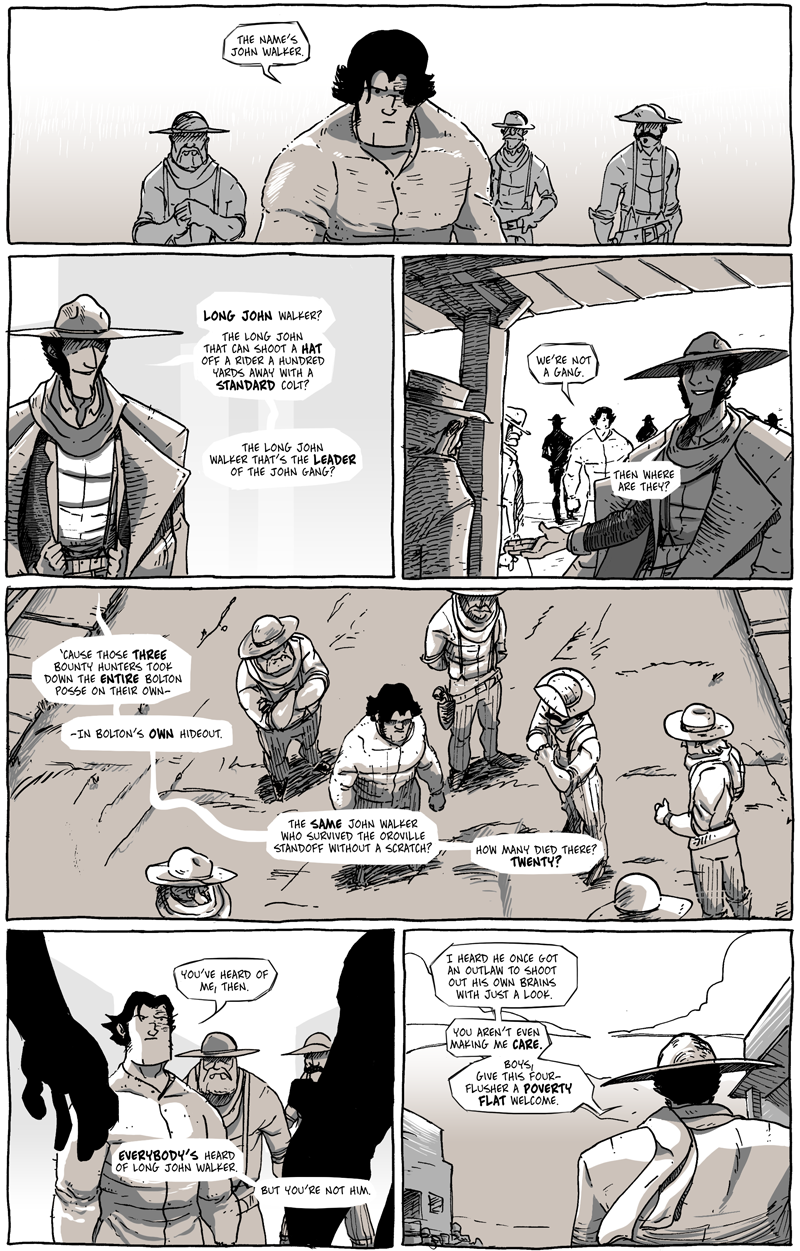 The Long John Walker that existed before page one of the comic was a pulp hero––he was the guy dime novelists wrote about and got paid per word for each fantastic story reported as fact from the Wild West. For all intents and purposes, Long John Walker was the Californian Wild Bill Hickok, the Wyatt Earp––but more than that, he was The Man With No Name and the Shane. He was the Western hero that has become an American archetype. More importantly, that’s the type of person everybody thinks about when the name Long John is mentioned within the context of the comic, even to Long John himself.