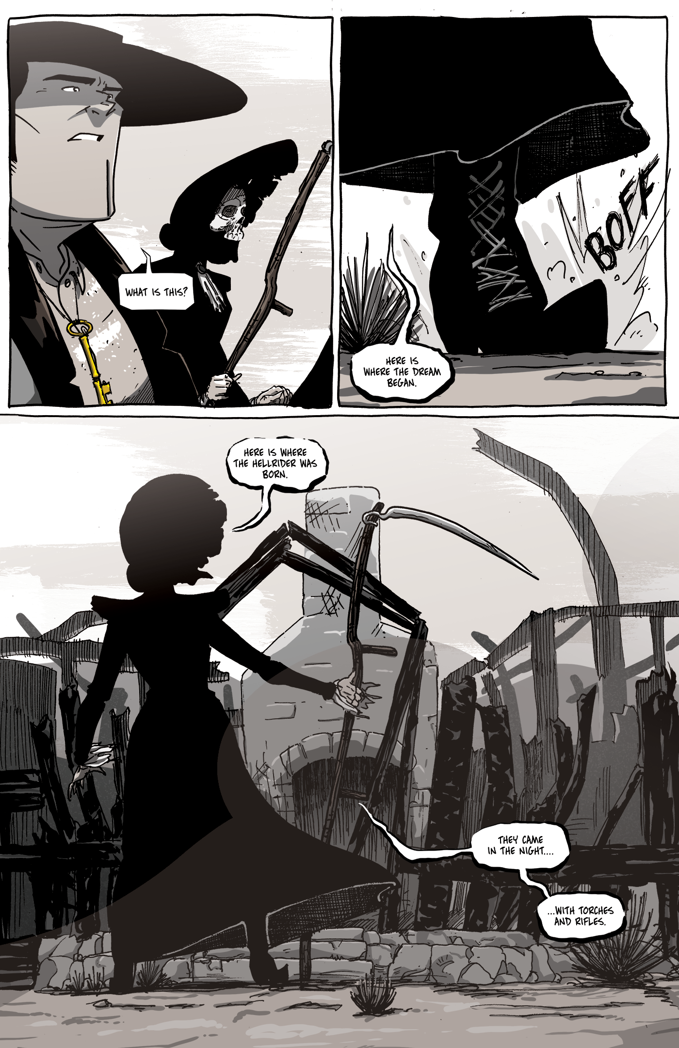 I’ve spoken in many places about things that I like to draw versus things I do not like to draw. By and large, the once-long list of things I do not like to draw has shifted into being a list of things I can draw (and don’t actually mind drawing) but it’s a chore. My previous series, Eben07, had me drawing a lot of difficult stuff––cars, buildings, weapons, planes, etc. In Long John, backgrounds were a bit easier because the Mono Basin is so remote and buildings are handmade with limited resources so things can look a bit more organic, wobbly, and imperfect. All things that are perfect for my style and, most importantly, my ability.