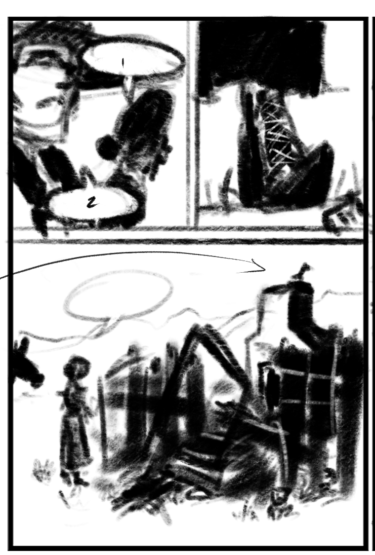 In the thumbnail for this page, I approached panel 3 from a much more architectural, perspective-based angle, which only made things more difficult. (Click for a larger version)