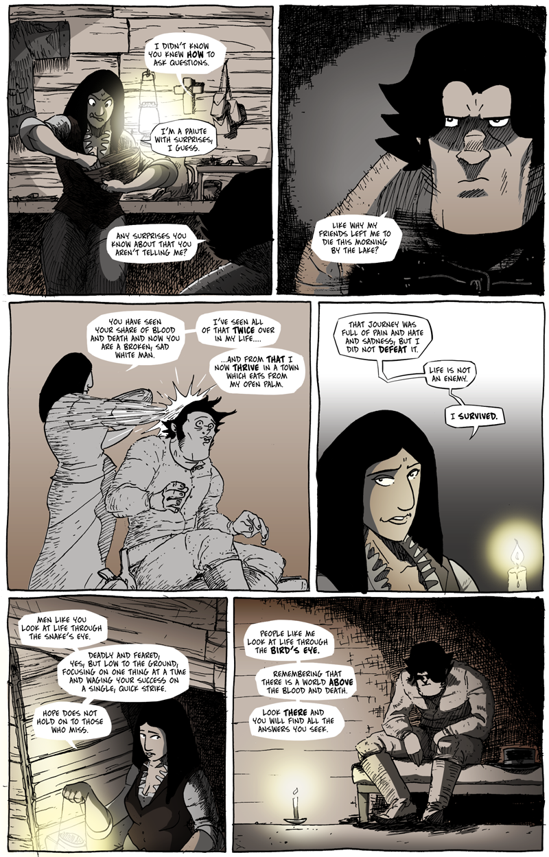 For the sake of clarification, Lady May belongs to (as does Johnny Mono, one-third of Long John’s pre-comic posse) what is classified as a member of the Northern Paiute tribe who inhabit the Mono Basin in the Eastern Sierra Nevada mountain range. More specifically, all of the indigenous people in this comic are Kucadikadi––people who live near Mono Lake itself. Since Mono Lake is largely an off-page presence in this comic––aside from the opening, which set the tone––the Kucadikadi are almost anthropomorphized aspects of that lake’s and region’s existence during this point in time, all while being independent characters, too. That’s quite a burden to carry. What it mostly informs is their attitude; the Kucadikadi people in this comic are staunch individuals with diverse interests and goals, but are always confidence in the face of doubt and intimidation––something which I feels summarizes Lady May quite well.