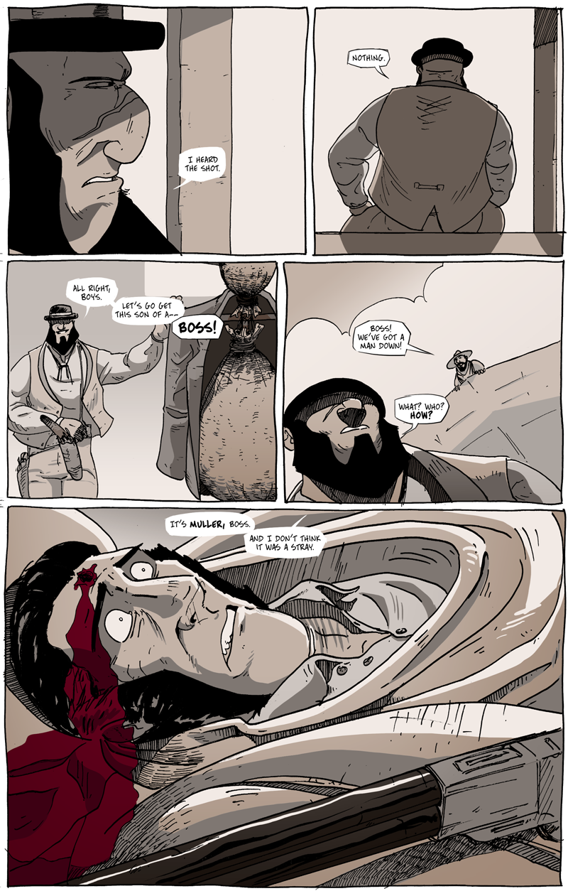 As a consumer of entertainment, I really like the moments that really show a character in an honest, believable light. I feel in those first two panels, we’re actually getting a clear look into Boss Fleming’s thought process. It’s a nice contrast against the guy we saw at the hat shop or picked Long John up from the sheriff––nothing but testosterone and bravado. But here we get to see a different side, and even though the end of the chapter is right around the corner, I really wanted to get this moment in here. That “quiet time” for Fleming isn’t something I planned from the beginning––it wasn’t one of those visualizations I had and knew I had to get to. Instead, when laying out these last few pages, some space opened up where I actually took out a short scene of Fleming shooting (non-fatally) the sheriff because he stepped out to defend Long John. With panels getting shifted around, I had some space at the top of this page, and I knew exactly what I wanted to do.