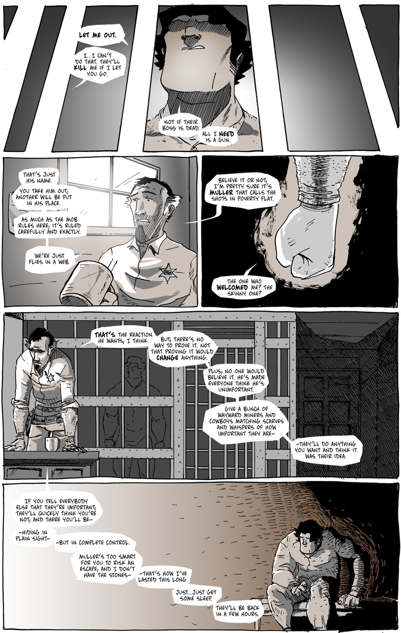 I’m not an expert prosodic analyst, but this imagery of a man somewhat blindsided as well as accepting of his defeat is powerful. That came to mind as I drew Sheriff Spencer looking into his mug, and my first thought upon that realization made him a much more sympathetic character to me, which altered his dialogue as well as his acting on this page, the previous page, and those still to come.
