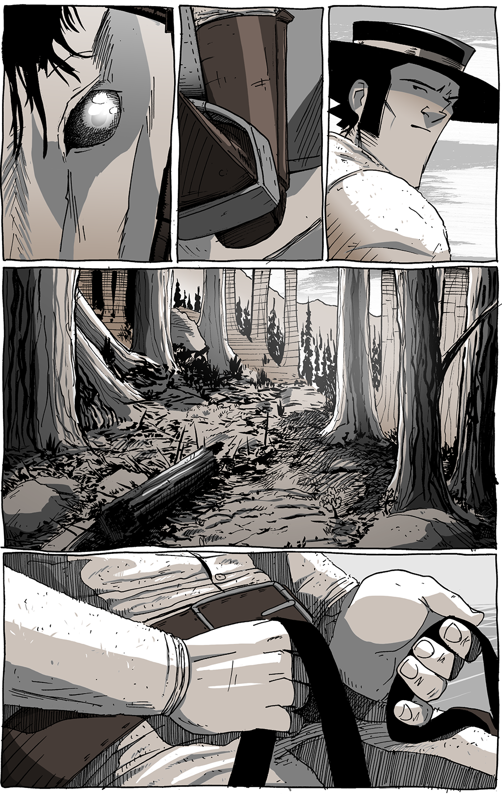 What this showed me was that art is much more about impression than duplication. Often on hikes with my wife, I’ve looked over a landscape and said, “I have no idea how to draw this,” meaning that the eye sees so much nuance and variation that seemed––based on the tools and tricks I’ve gained over years of drawing––impossible to draw or so complicated to the point that I wouldn’t want to draw it. But you can capture a lot with a smear of ink, a splash of white out, a dab of ink-soaked toilet paper (really!). Comic art, specifically, is much more impressionistic than I realized and, because of that, seems a bit less insurmountable than it used to. I look at my knowledge and my tools and my ideas now and say, “Hell, I think I can do this,” which is a far cry from where I was when I started not only this chapter, but when I started Long John, or when I started drawing comics in 2007.
