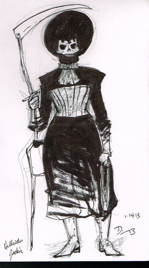 But what of this creepy Hellrider character? We have definitely not seen the last of her––and there will be some exciting announcements that involve her (but are not about her) that I’ll be making in a few weeks. Stay tuned for that! To appease the masses until then, here’s the first design of Hellrider Jackie (as I’ve come to know her) that captured her character though she has changed in ways since then.
