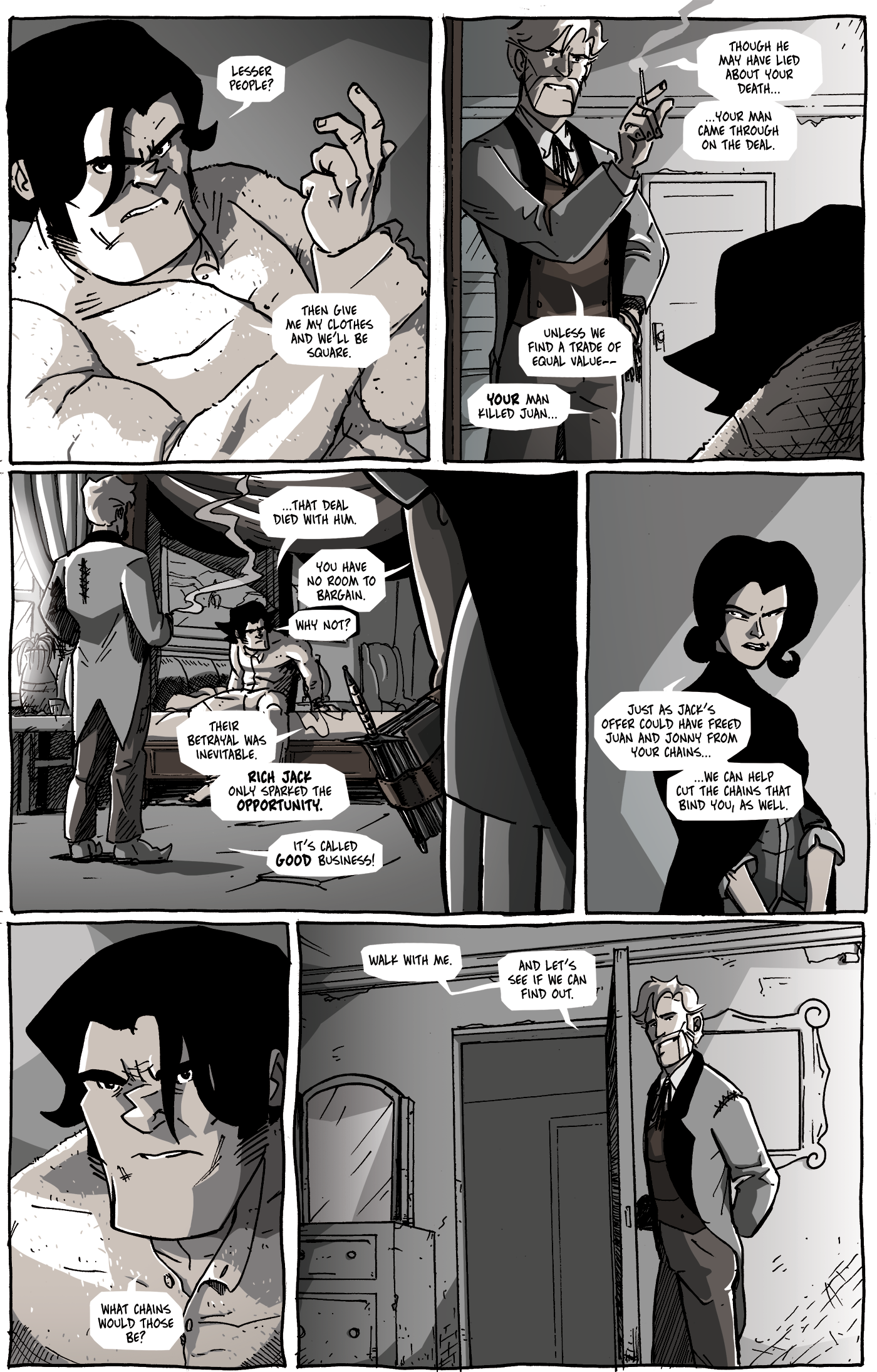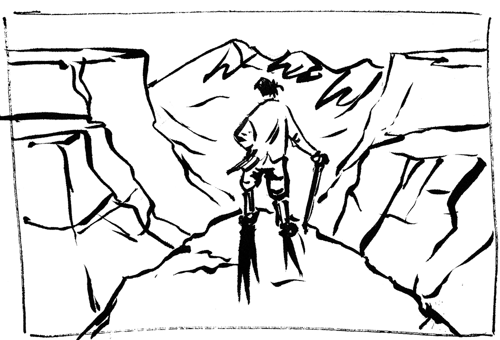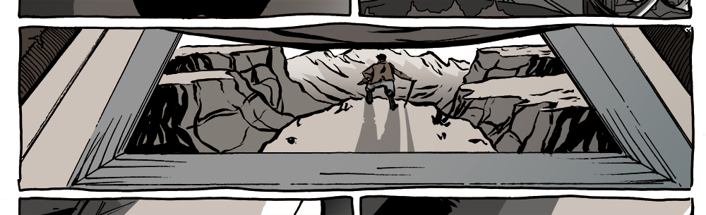 The idea of this shot energized me because it enhances the confusion one feels waking up in a strange and new place. However, drawing a painting that’s upside down and in perspective sounded like a nightmare. It can be done with time and attention given to laying out the perspective, etc. But I had an entire page, and an entire book, to draw. I didn’t want fretting over a painting that only kind of appears in full in one panel on one page to slow me down.
