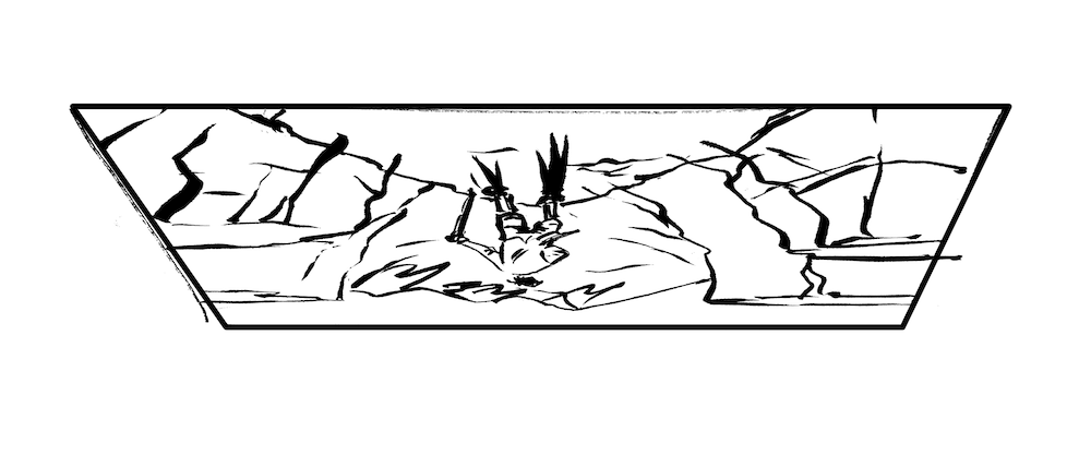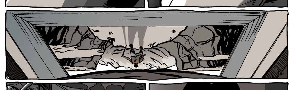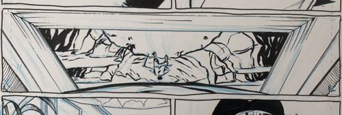 With that, I scanned in the image and paired it up with scanned lineart of the page. Flipping it upside down, I used Photoshop’s “transform” tool to nudge the painting into perspective with the rest of the page (which had been worked out by hand). With the painting now in correct perspective, I printed that manipulated image out at full scale. Using a lightboard, I put the printout underneath the page and drew the painting in, essentially tracing the image I had printed out but with more careful linework.
