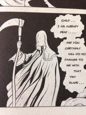 While both the Hooded One and this new character, Hellrider Jackie, echo western culture’s idea of death incarnate, I did want to pay homage to the coolest death-like character’s word balloons with Jackie; so, wobbly lines and trailing tails it is.