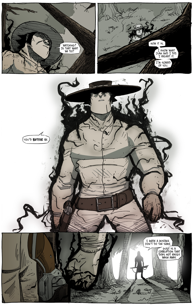 I wanted do incorporate something like this in Long John, especially regarding the internal conflict between his old way of thinking––his arrogance and entitlement––clawing to take his mind back over. Basically, it’s “the rot” that Hellrider Jackie warned about way back at the beginning of the comic. It’s strictly figurative and not something that exists in the world itself. Perhaps it’s a step too far, but it’s a step I’m willing to take.