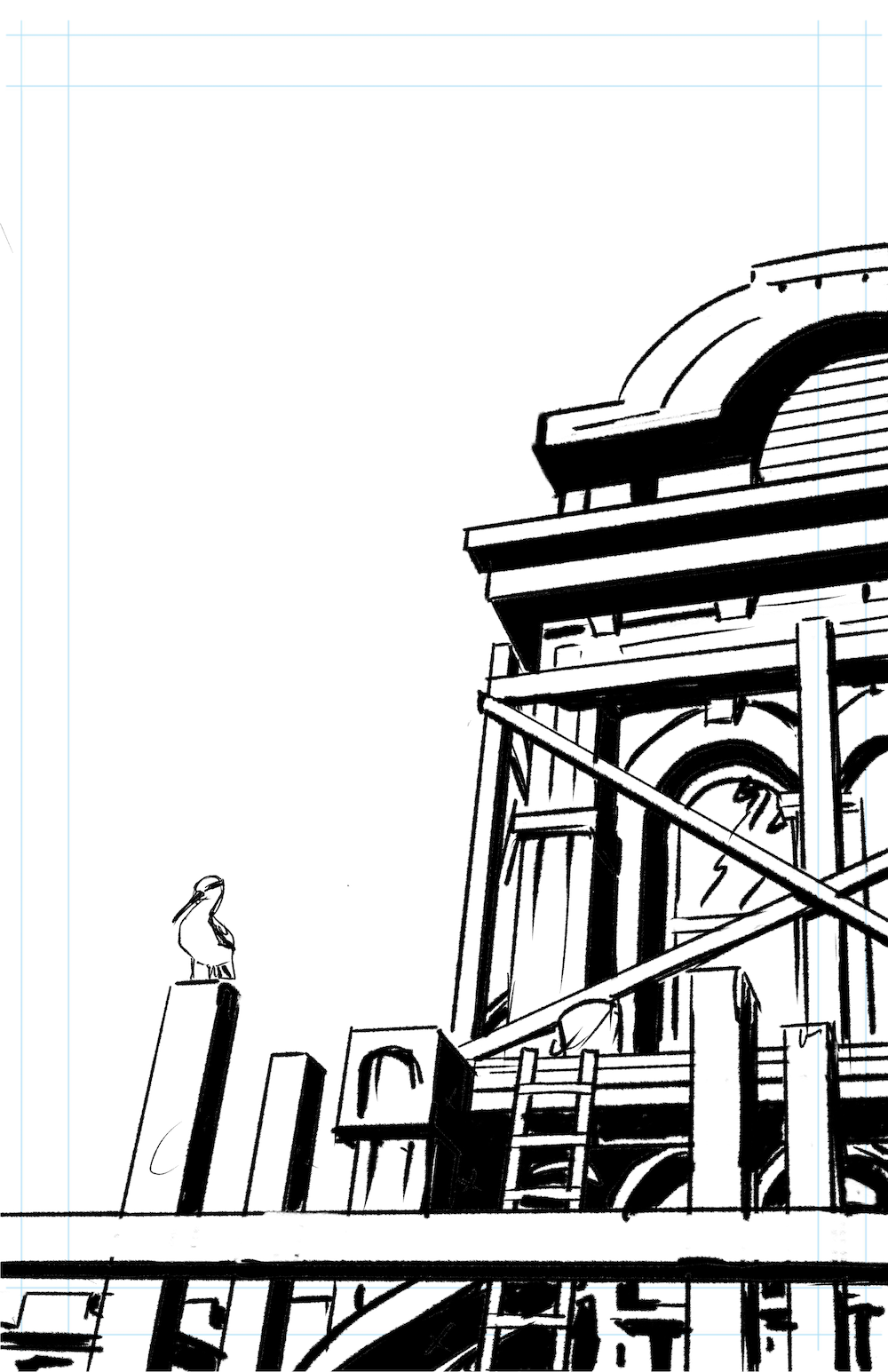 With that in mind, Chapter 5 is really the beginning of the end (I think of Chapter 4 as kind of an interlude), and, to that end, I think of this opening page as a sister piece to the title page of Chapter 1. I like the contrast––the natural against the constructed, the ancient and the brand new, the humble and the austere. It’s a juxtaposition that will only continue to clash as we move forward through this chapter and the end of Long John’s story as planned.