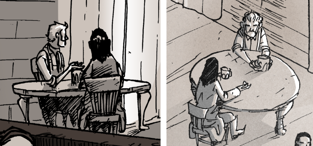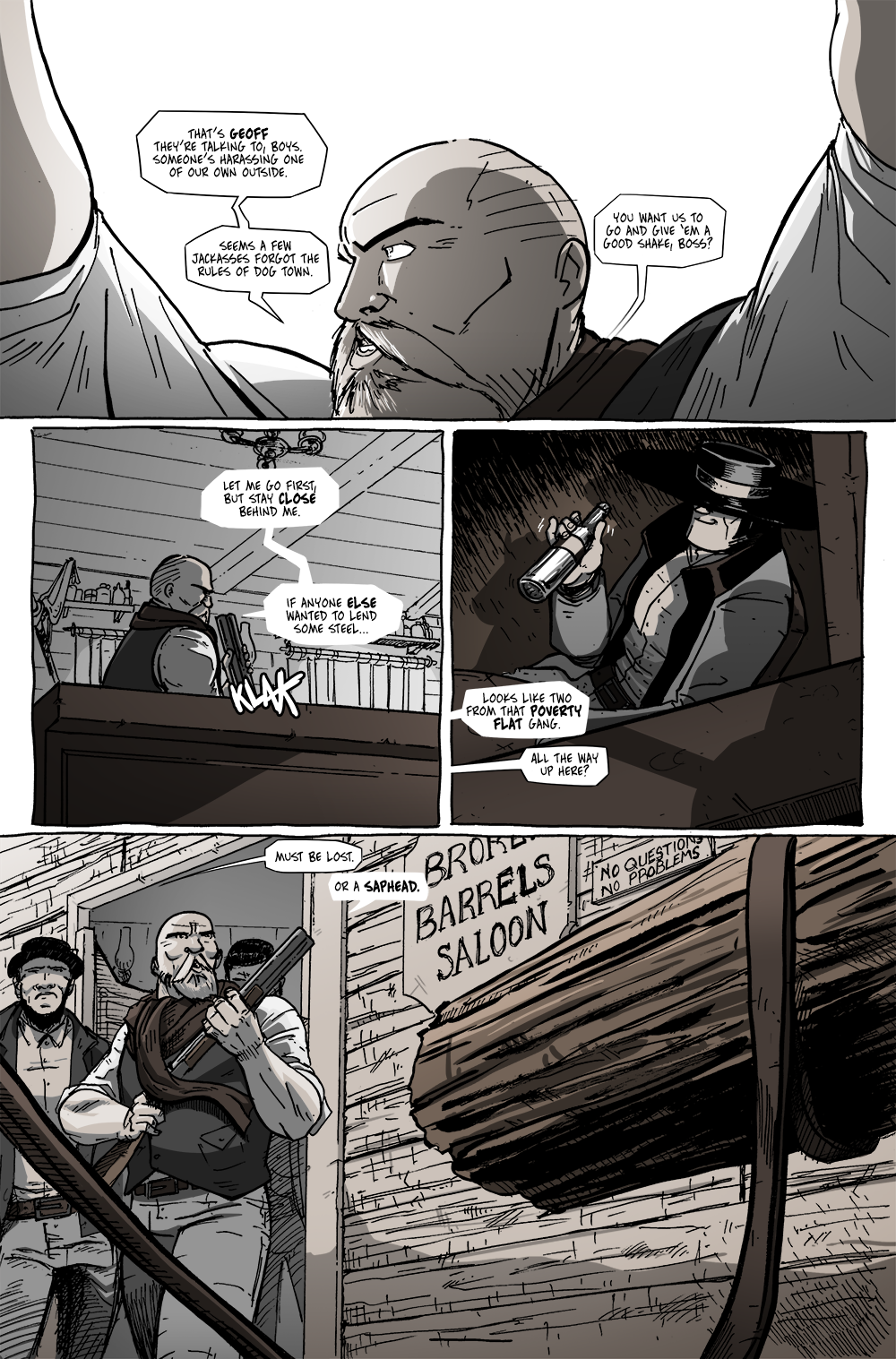 Though we’ll hear the name soon enough, the bartender and owner of The Broken Barrels is a gentleman named Larry. And Larry’s design was initially meant to be a shout-out to a friend of mine named André. It wasn’t until I started laying out the pages, penciling them, and seeing them in the context of the entire chapter where I saw Larry became a pivotal character within the context of this chapter.