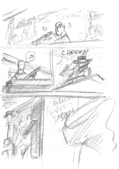 The truth is, I don’t have a problem designing major characters––protagonists and antagonists, messengers and gatekeepers (to borrow from Campbell)––but designing incidental background characters can be a bit of a chore. I think part of it has to do with not wanting to waste a design. So, sometimes, I use very bad likenesses of people I know or amalgams of people I know to fill in the gaps because it’s just easier that way (I have always tried to always work in appearances of myself and Josh Tobey into crowd scenes––we made an appearance on the previous page).