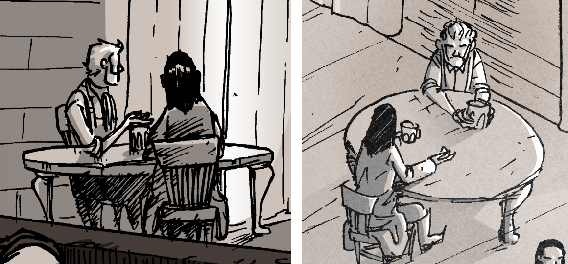 With Chapter 4, however, something unexpected happened. I should have seen it in the thumbnail and scripting stages, but a character that I wholly thought was just a background character stepped out from behind the bar, so to speak, and became a bit more than just a face in the crowd.