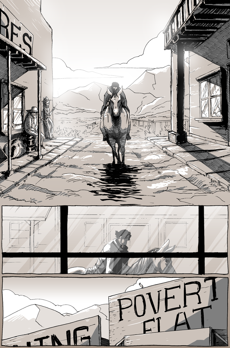 The town he’s wandering into is called Poverty Flat in the comic. In reality, Poverty Flat was the progenitor of what is now Lee Vining, CA. However, the town didn’t officially have that name until the 1950s; so, you know, that wouldn’t work. A few sources confirmed that Lee Vining originated as a podunk mining town without many amenities nor visitor appeal––it was, at its heart, utilitarian. Lee Vining is still a rather small town, and though it has a deep history, it’s not a very widely recorded one, visually. Many of the photographs I could get my hands on were taken after the start of the 20th century and, though they were minutely helpful, weren’t very useful to help create the look of Poverty Flat in 1881.