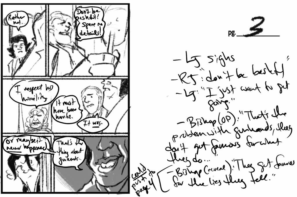 As mentioned on the previous page, this opening scene was a struggle because I couldn’t decide where to start. Originally, we opened to Long John waking up the morning after we left him at the end of Chapter 5. Then I pushed it a little forward, so the scene opened with the ka-THUNK ka-THUNK sounds of Long John dragging the trunk full of his clothes down the stairs on his way out. Both openings would have him getting caught trying to leave by Rich Jack, who would then forcefully invite him to breakfast. Knowing that the first major scene was this breakfast conversation (and what happens at it), those two openings ultimately took too long to get there. So, I figured to cut the fat and start with Long John sitting grumpily at the table.