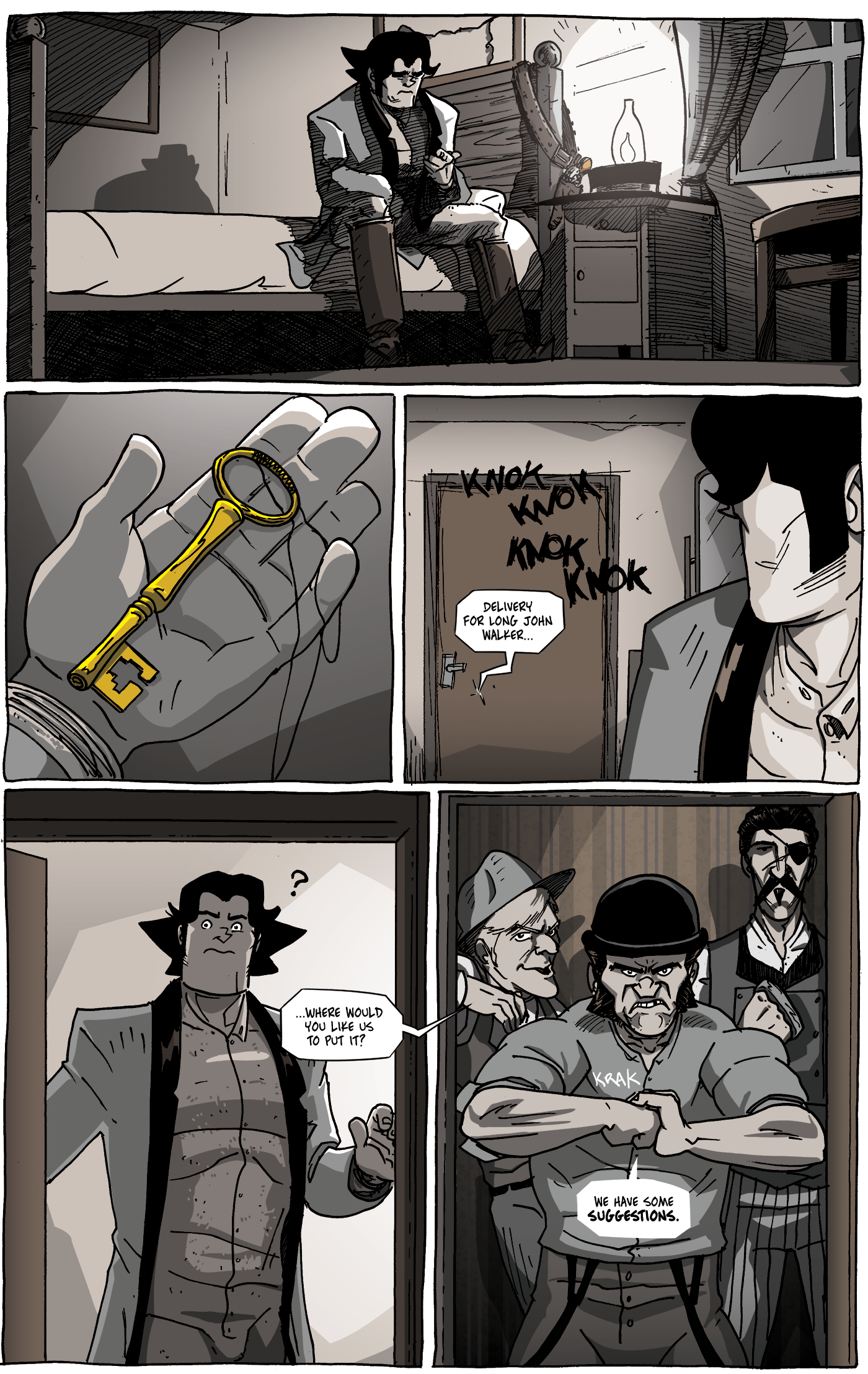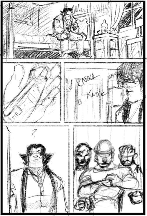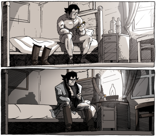 Everything about an image becomes a tool for expression and a lot of it becomes a matter of tweaking once the basic shapes are laid down. I find it fun to sit and consider the context for the image, to make it more than just a stock “person looking sad” image, but instead trying to really convey in their acting why they’re sad even if the reader doesn’t have the context. With hope, you can feel the weight on Long John’s shoulders on this page. You can that he’s wracked by a sense of guilt that wasn’t quite there before (or not there as much). With hope, you see him as a clear and independent character instead of just a stand-in for one. That’s the hope, anyway.