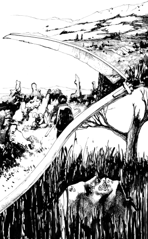 I really wanted Josh to utilize his unique artistic perspective when approaching this page. In fact, the only thing I drew on the layout was the scythe and told him to interpret the slaughter she was committing any way he wanted to. When I got the page back, my immediate reaction was probably the same as his when he finished it (see his notes below). But as I thought about it, and really thought about her character and her story, I really came to love how much land he put in those panels. Hellrider Jackie doesn’t care about people inasmuch as they are not separate from the greater whole that is her home, this land (and lake) on a rather flat landscape that also happens to be nearly 7,000 feet above sea-level. Jackie, like the land around her, is a mess of apparent contradictions and long-lens vision (metaphorically speaking).