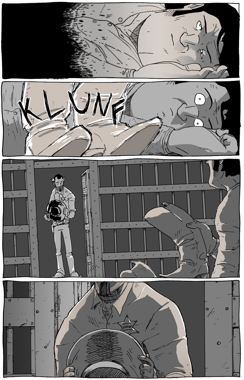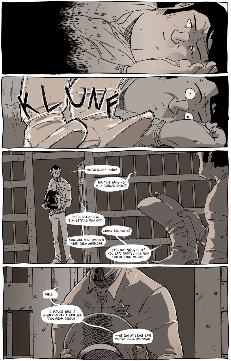 An interesting thing I hadn’t considered when deciding the artistic foundations of Long John was the passage of time within the comic. Obviously, some aspects are easily controlled by pen and ink––at night, I could use heavier lines and more shadows, etc. But then there are things like sundown. How do you draw “sundown”?