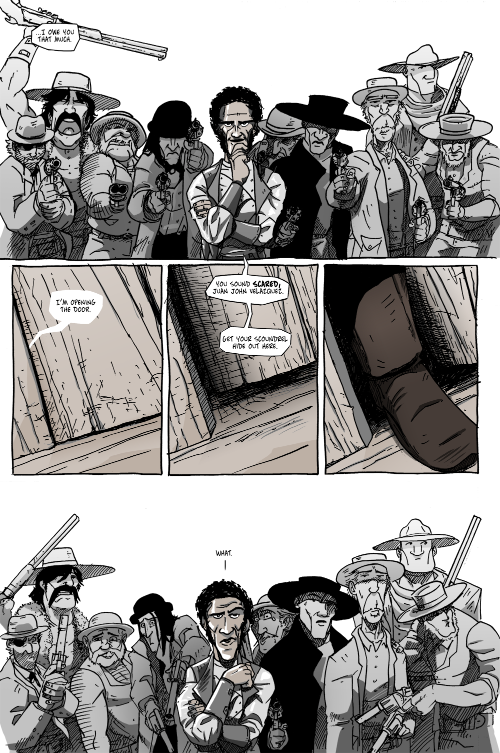 This page was a task to draw, as they all are. Of course, drawing a crowd scene is in itself a focused and daunting task, but it’s fun enough because I get to draw a bunch of faces, which are my favorite things to draw in the first place. So, drawing a crowd was not the scary part. Drawing two crowd scenes wasn’t even the scary part. It’s that the first and last panels are, sequentially, very close together, like two frames out of a film. So, they not only had to be of the same crowd, but I had to make sure each person was in the same spot at the same height and were overlapping each other in the same ways and looked different enough from the first panel to be clear that they were reacting to Long John exiting the house. So, the second panel had a bit of the fun taken out of it because there was a lot of measuring and a constant bouncing back and forth between it and the first panel. The saving grace was, again, the faces, especially as they reacted to seeing a dude in his underwear. To that end, the hard work was worth it because this ended up as one of my favorite pages from the chapter.