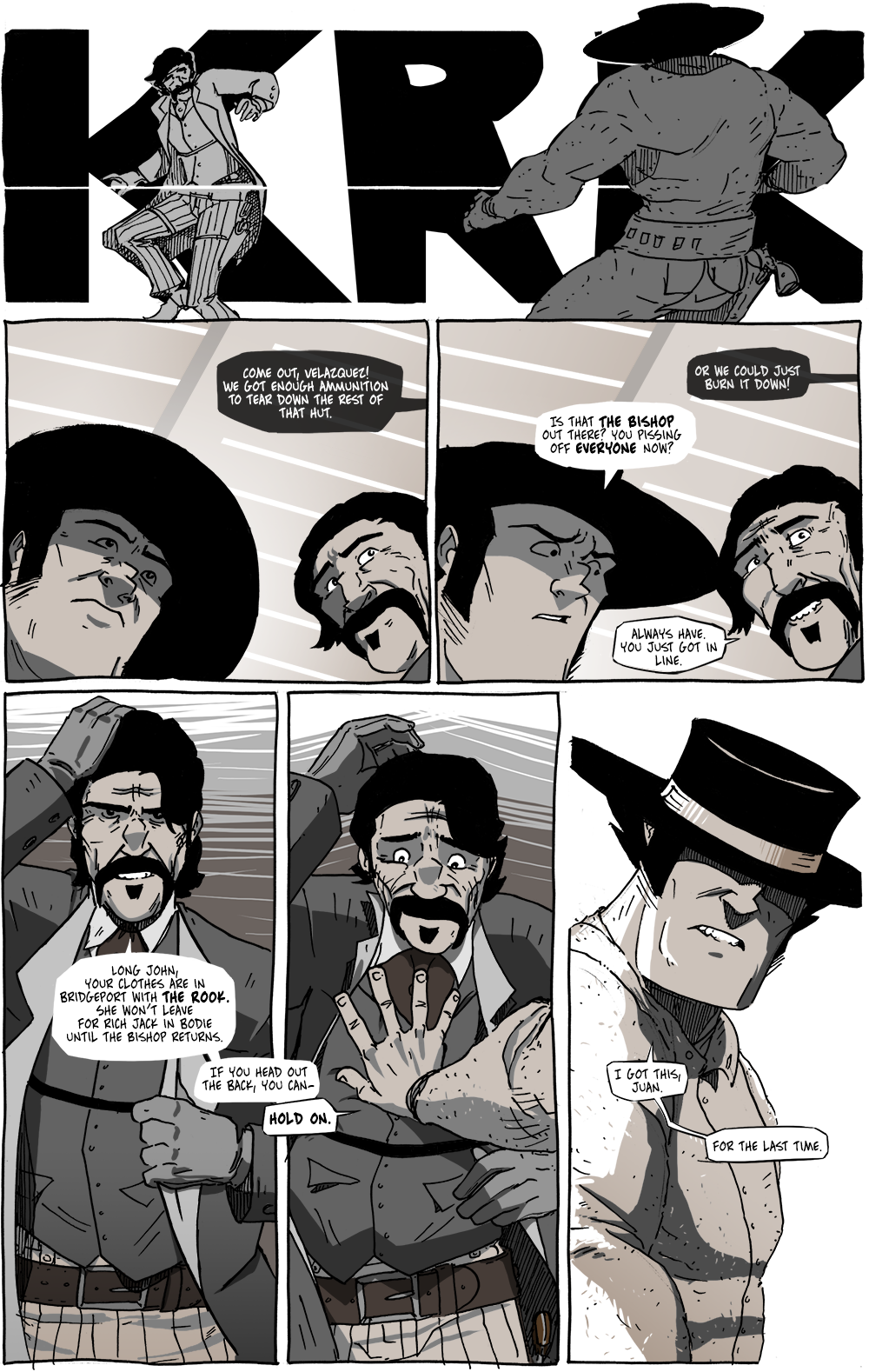 The things I do fudge are distances between towns and a little bit of the geology. More than once while drafting out the map of events did I have to scratch ideas because I wanted him to go to town X but it would literally be out of the way to take him there, for example. “But it’s got such a cool name!” I plead to myself before making arguments for and defenses against fudging those facts. That’s why you see very few Stetson-style cowboy hats on characters as they weren’t particularly in fashion at the time. The most common types of hats (at the time, again) were the flat brims that Long John wears and the fashionable wore bowlers (hence Boss Fleming in Chapter 1 wearing a bowler––he was a brute that wanted to present as fancy).