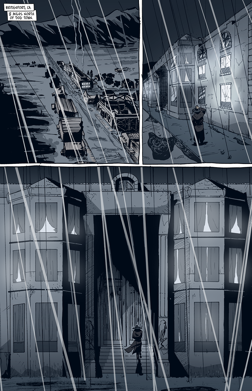 It’s a hotel that belongs to a character called The Rook, and I wanted it to be monolithic. I had the image of a figure walking up some steps and is dwarfed by the towering entryway, like something out of a Poe story. I got that part, at least, but the final panel is one of the few panels I look at and think, “If given another shot, I could do better.” As with everything, you have to call it “good enough” sometimes in order to move on. By no means do I look at every other panel I draw and think that it’s perfect, but I have learned the skill of seeing that it does more good than bad. As long as it’s clear enough for the reader to understand, then I’ve done my job. And it was by that metric that I put my pencil and pen down on that panel.
