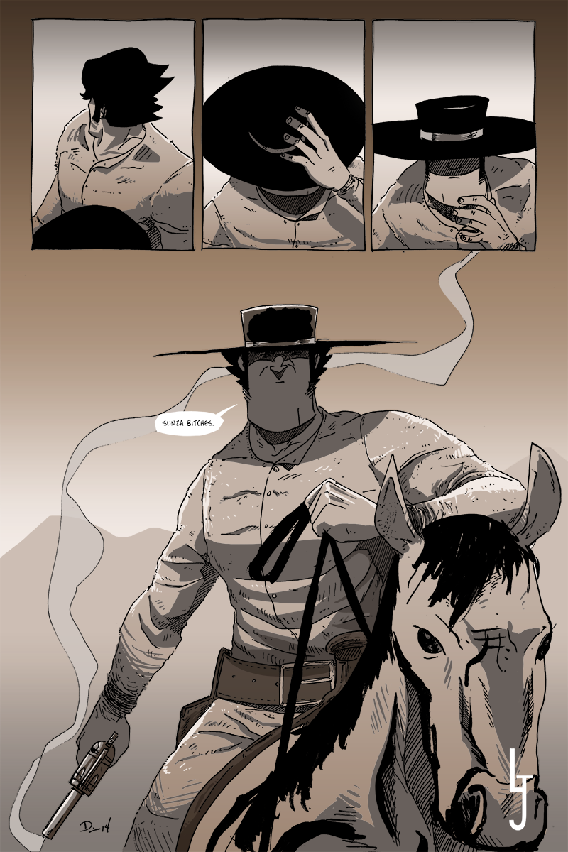“Sunza” was designed to do a few different things. Obviously, it was written to open up the Long John story––to introduce the character, the inciting incident, and present a choice that must be made. However, it was also designed to kind of be a stand-alone story, especially without the first ten pages he has with Hellrider Jackie. It’s a strange little story, admittedly, but one that––with hope––works as a little western anecdote.