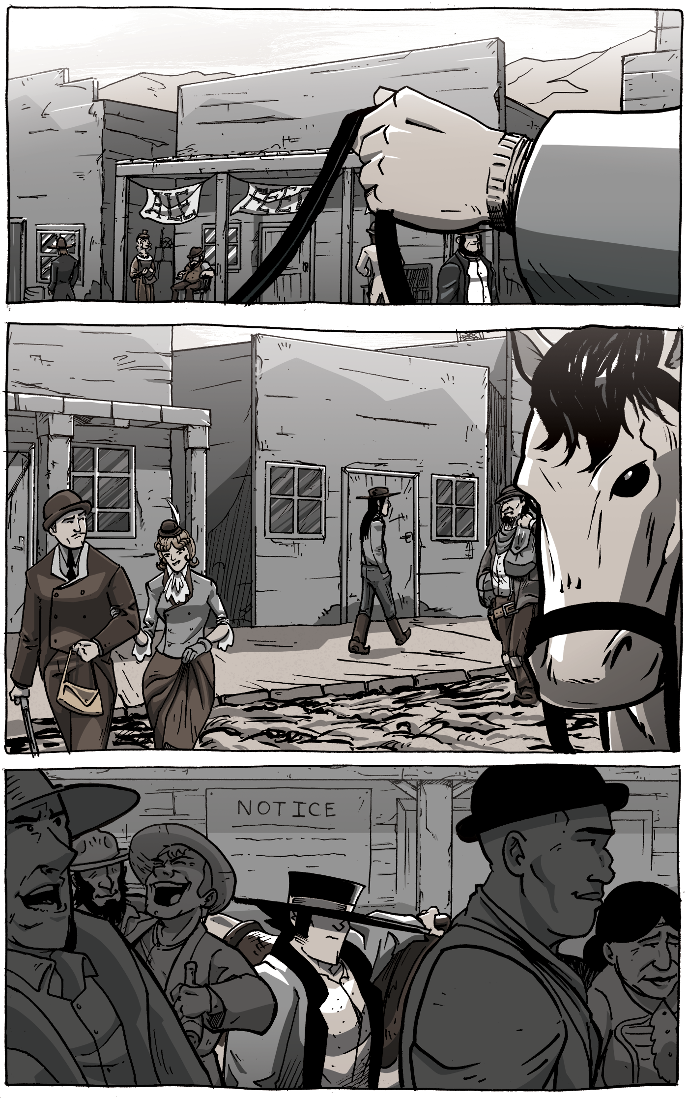 These first three pages were the last to be drawn for this chapter. As I said before, I knew I needed some kind of establishing shot, I was just putting it off. But as the deadline came closer, I had a choice to make: because of the manner in which books are printed, I could add one page or I would have to add three. Surely one would have worked, but the cinematic possibilities of having a slow approach on this town––one which had only been previously visited at night, in the rain––intrigued me. Add on to that is the fact that this was starting a new chapter; so, it needed to not only establish the town, it needed to start the story. So, at the absolute last minute, on an “emergency” road trip out to the Mono Basin (it wasn’t really an emergency; but it makes me feel more professional to call it such), we went to Bridgeport and out to the valley, just to get enveloped in the kind of landscape, architecture, and environment of the area. There were some great landmarks, particularly the old courthouse, outside of which was a cool old brick wall with steel fence, behind which was an abandoned (but well maintained) wagon. Those seemed like great images, and were the basis for my first attempts later at our camp site.
