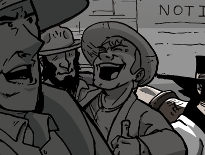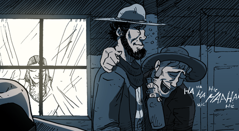 Drawing crowds is never easy––it’s fun, for sure, but not easy––and it’s always nice to throw in some familiar faces to make the process go a bit faster. So, these two guys also appeared in Chapter 4, in the extreme foreground of the bar as Long John and Geoff are having some serious conversations before things go haywire: