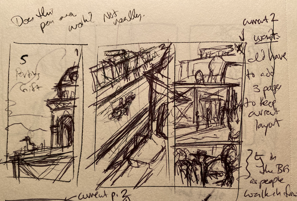 But, like most creative things, images and story coalesces after it has time to settle. While I had been attempting to add a single page until this point, when I started thinking of it as three pages, more ideas started coming together––an actual narrative that cinematically and satisfactorily got the new chapter off to a comfortable and interesting start. Once I started thinking of it as a three-page opening, the ideas came together quite fast, as evidenced in this messy, but readable (especially in the context of the finished pages) thumbnails I threw together on a dilapidated picnic table, one side of which was held upright by a sawn-down tree stump.