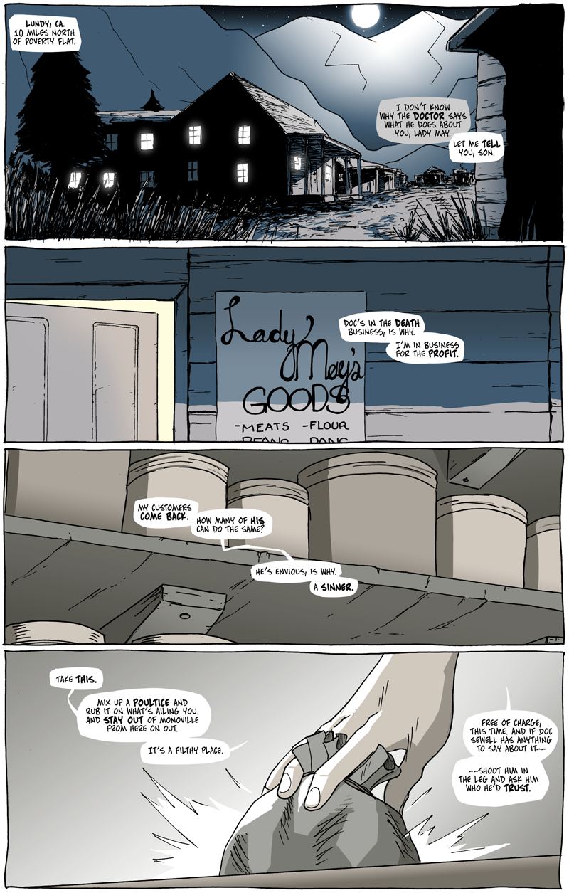 In terms of history, the Lundy presented in Long John is much more honest than Poverty Flat. To tell the truth, the story in Poverty Flat could have happened anywhere, and my study of the town came in mostly with regard to geography. The story of Lundy itself intrigued me––and the town was added to the comic rather late––and its rushed birth, expansion, and death are not only a poetic analogue to Bodie itself, but produced a chaotic but communal environment that works perfectly as the home for the Johns’ contact (who we’ll learn more about in the next few pages).