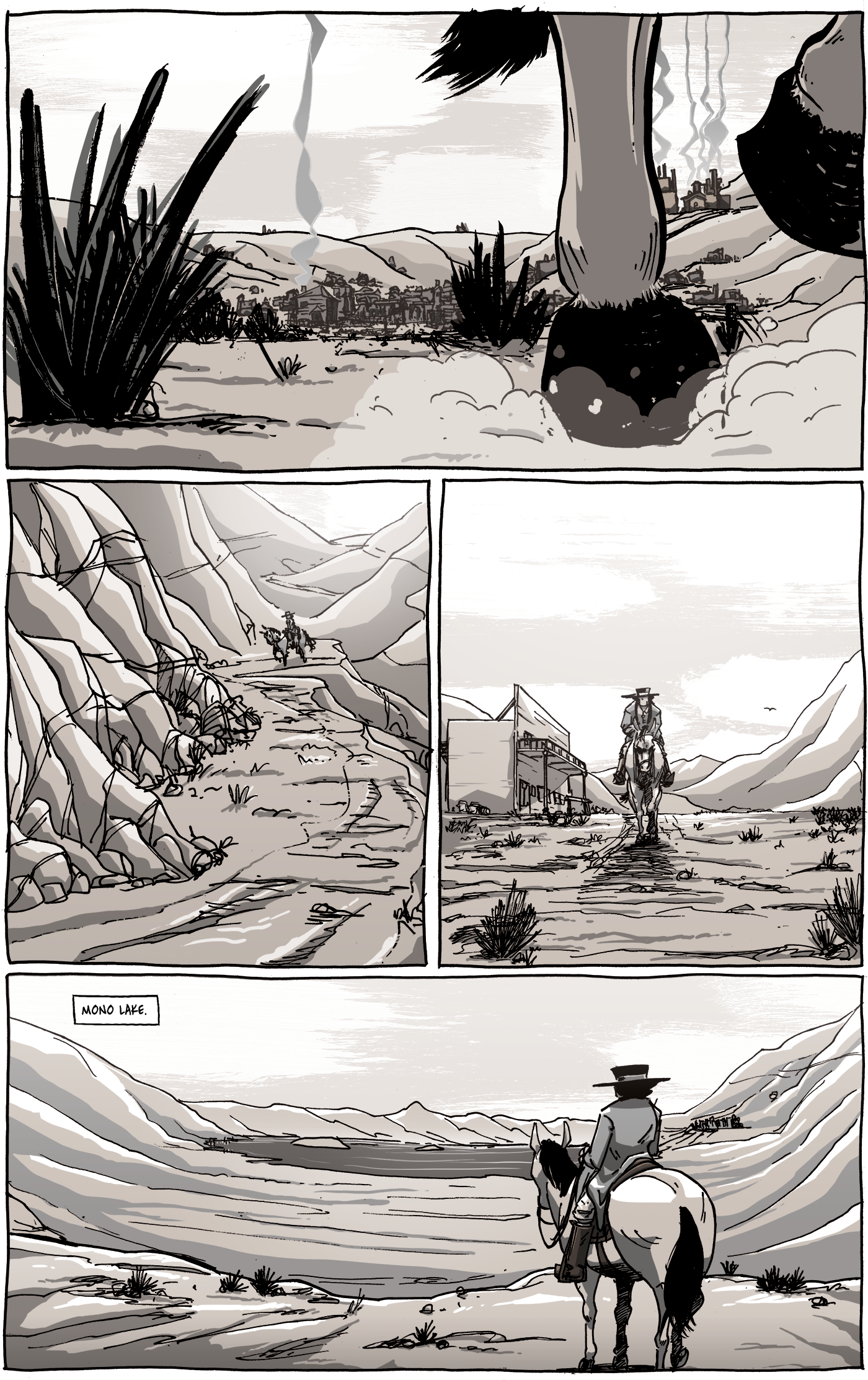 While I’m confident that there’s a strong sense of “place” in Long John, with each location having a unique quality and purpose to it, it’s hard to really show how they all fit together. There’s no real need to do that, ultimately; the reader assumes that these places are within riding distance from each other. However, due to the fact that the story does take place in a real region of California, that all of these settings (despite a strong level of artistic license has been taken) are actual places, for some reason the desire to show how they all stitch together strongly sits in the back of my mind. That’s why we see Bodie in the background of panel 1. When you come down the mountain from Bodie, the road puts you right at Dogtown (where chapter 4 takes place), which we see in panel 3. Riding south from Dogtown will take you to a cliff-side road that overlooks Mono Lake (panel 4).